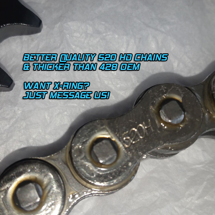 | Heavy Duty 520 Stronger chain lasts longer than thin OEM 428. |
