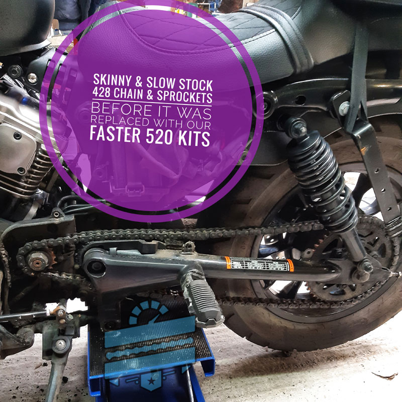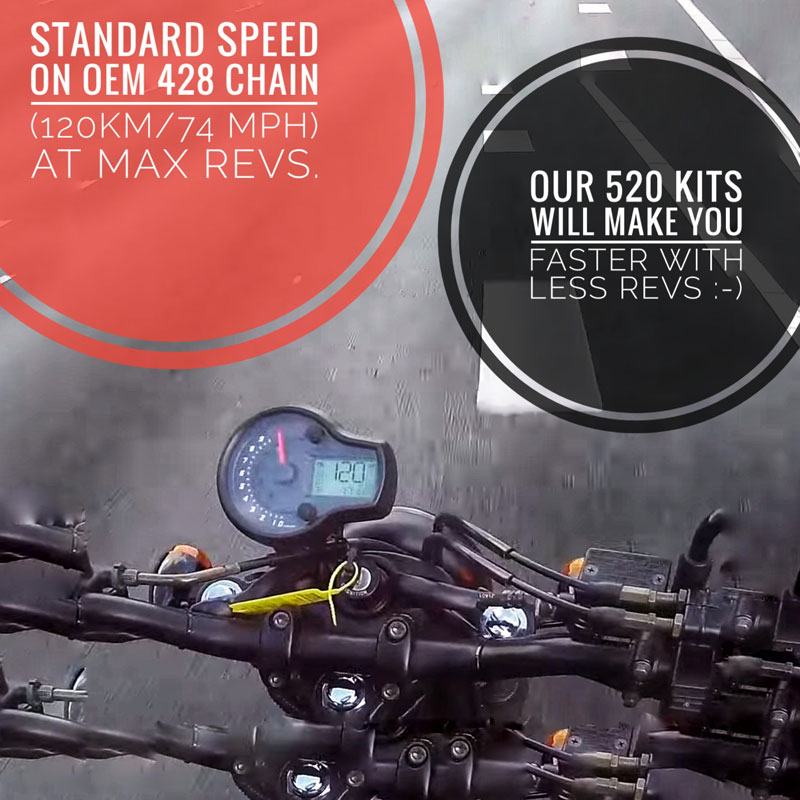 Following the exceptional success of our Carburetted GV125C 520 chain & sprocket kit, we are proud to offer the first and only complete 428-to-520 conversion kit for the injected Hyosung GV125-S EFi Bobber (2019+). This bespoke kit is engineered for great performance and durability.